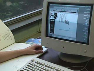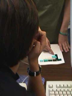 In the Computer Arts Technology Studio of the Pennsylvania Governor's School for the Arts, two visual arts students engage actively in a critical response situation brought about by Tara Rose inviting Gilbert Ho to comment on her graphic design, a poster for Mother's Against Drunk Driving (MADD). |